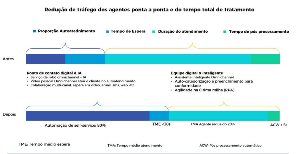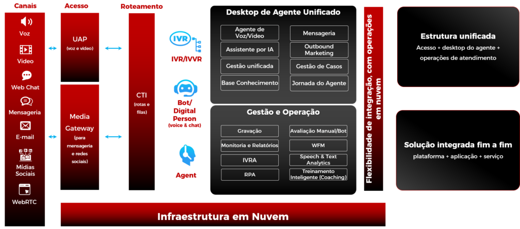 Omnichannel, Self-Service de vários tipos, Interface Unificada de Agente, aplicação de IA ponta a ponta.